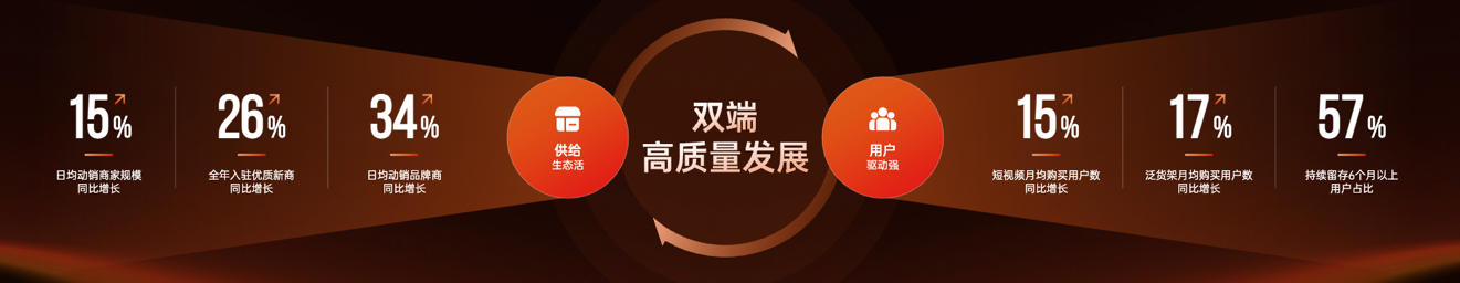 第二,电商与广告流量融合,实现商家经营规模突破。 2025年第四季度,平台整体推动线上电商与广告流量一体化池子打通,整合成基于买家行为和商家综合价值的分发机制,使商家获取流量更加精准,价值评估更加客观,加速从双好驱动的全域经营增长。整体流量覆盖更加多元化,广告不再局限于内容货架投放,也可以通过闭环电商广告稳定扩大影响力,商品卡在搜索中的展示位置及直接针对货架的投放方式,让商品卡投放路径与货架增长更加可控,帮助商家在商城环境中找到适合自身经营策略并实现GMV增长的道路。