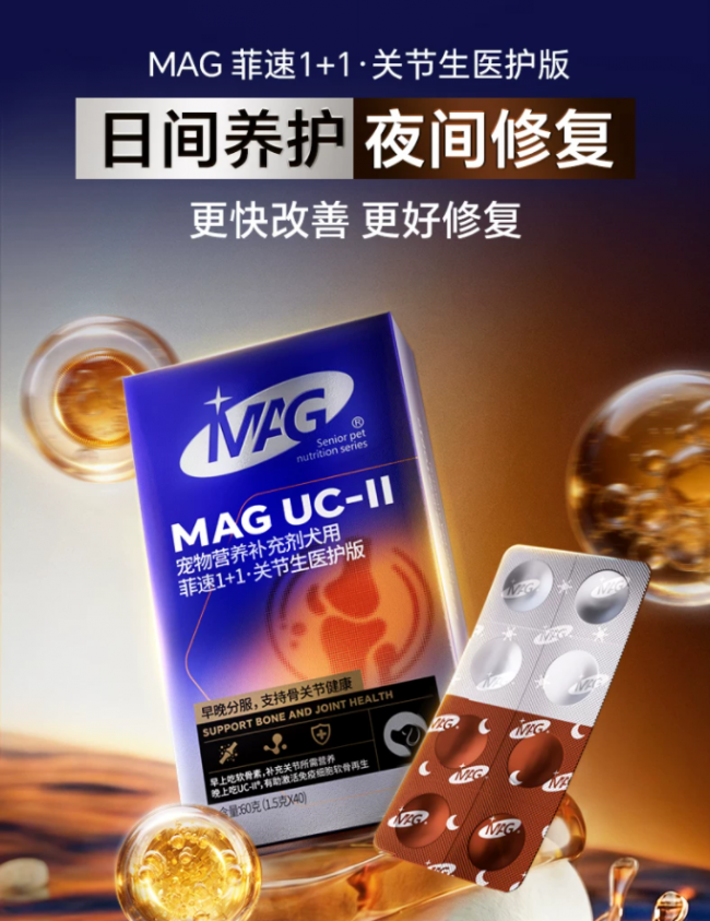 随着宠物养护理念不断升级,关节健康已成为犬猫日常保健的核心关注点。髌骨错位、走路跛行、跳跃障碍、关节肿胀、运动无力等问题,严重影响宠物生活质量,科学、高效、安全的关节养护产品,成为万千养宠家庭的迫切需求。MAG聚焦宠物关节健康痛点,创新推出菲速1+1关节生,以日间防护+夜间修复的科学分服模式,搭配高纯度原料与专利成分UC-Ⅱ® 非变性Ⅱ型胶原蛋白,为犬猫提供全天候骨关节健康支持,重新定义专业级宠物关节养护标准。