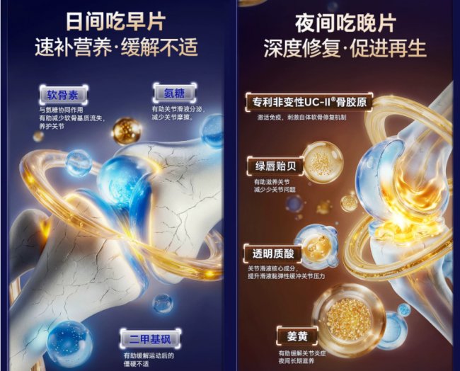 在配方设计上,MAG菲速1+1关节生实现科学配比、精准高效。白片专注日间防护,富含高含量葡萄糖胺盐酸盐与硫酸软骨素钠,有效促进软骨与关节囊液再生,补充软骨营养,修复受损组织;晚片聚焦夜间修复,含UC-Ⅱ® 非变性Ⅱ型胶原蛋白,借助口服免疫耐受机制,调节免疫细胞活性,阻断炎症反应,激活软骨再生能力;搭配绿唇贻贝、姜黄等成分,协同抗炎止痛,参与软骨基质合成,全方位强化修复效果,真正实现日间补营养、夜间修软骨。
