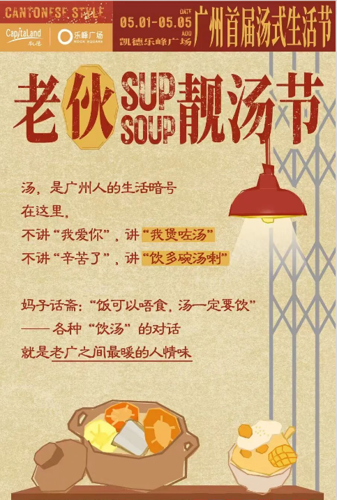 作为本次活动的重头戏,“老伙靓汤节”于5月1日至5月5日在凯德乐峰广场火热开市。现场集结超30个靓汤品牌档口,从经典的广式炖汤到新派养生汤饮,一应俱全。活动以“OLD PAL, SIT DOWN AND SIP SLOW”(老伙计,坐低慢慢叹)为核心主题,倡导“用心煲就系靓汤”的理念。市民可以约上三五好友,在汤香四溢的市集里慢慢逛、细细品,一边挑选心仪汤品,一边闲话家常,让快节奏的都市生活在此刻按下暂停键。
