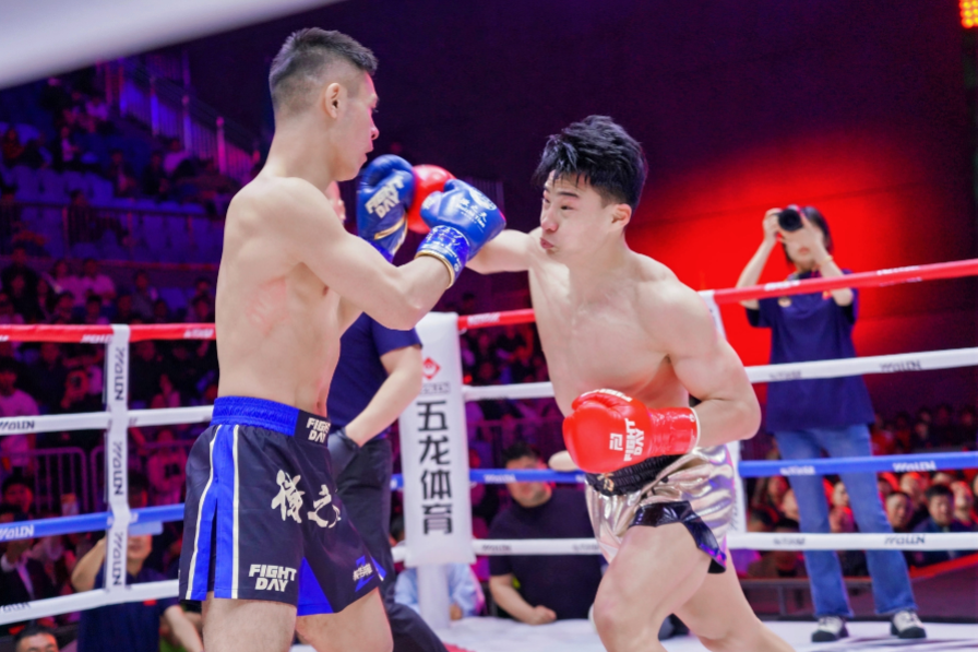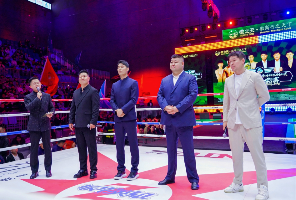 当晚,“徽之天皖美农品”拳力助农创业赛正式拉开帷幕,将整场活动推向高潮,实现了“体育+助农”的创新融合。活动现场,灯光璀璨、氛围热烈,暖场环节过后,少儿组垫场赛率先点燃现场气氛,随后灯光秀、直播倒计时、开场舞《驭风而行》依次上演,战队运动员整齐亮相、奏唱国歌,尽显体育风采与家国情怀。主持人固珺登场后,强调“每一记重拳,都为助农而战;每一声呐喊,都为乡村发声”,生动诠释了“拳力助农”的核心内涵。