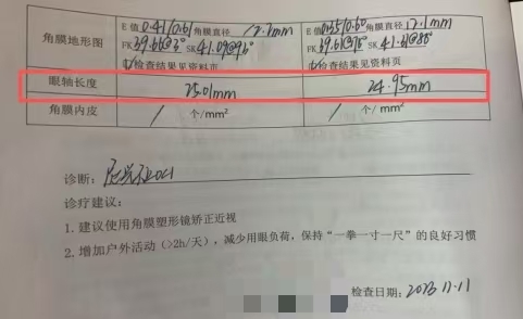 更值得关注的是她的眼轴长度:右眼25.01mm,左眼24.95mm。“对于14岁的孩子来说,这个眼轴长度已经偏长,意味着近视度数还有继续加深的可能。”视光及小儿眼病科主任刘巧萍解释道,“眼轴每增长1mm,近视度数大约会增加250-300度;眼轴大于26mm,合并视网膜相关并发症的风险就会增加许多。”
