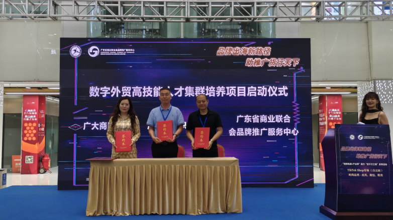 现场举行了简短而隆重的“数字外贸高技能人才集群培养项目”启动仪式。广东科贸职业学院刘思伽校长、广大商贸城执行董事罗倩婷女士、广东省商业联合会品牌推广服务中心主任谭振辉先生共同上台,正式签署了三方合作协议。本项目标志着广东科贸职业学院将携手广大商贸城及广东省商业联合会品牌推广服务中心,开启复合型数字外贸人才培养工作的全新篇章。