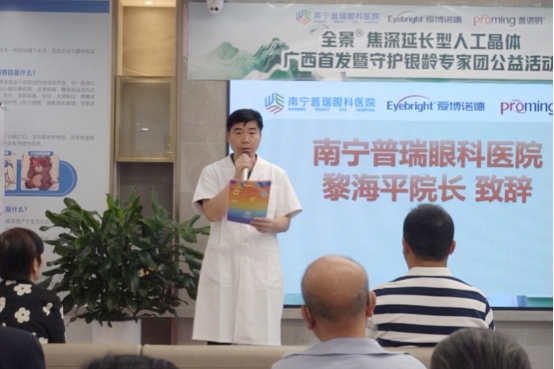 南宁普瑞眼科医院黎海平院长在致辞中表示:“南宁普瑞眼科医院始终秉承‘用爱传递光明’的宗旨,不断引进同步国际标准技术,积极践行社会责任。全景焦深延长型人工晶体的广西首发,标志着我院屈光性白内障手术迈上新台阶。同时,‘守护银龄专家团’公益行动的持续开展,体现了医院对老年群体眼健康的深切关注。我们将继续以专业技术和人文关怀,为八桂大地眼病患者提供更优质的医疗服务。”