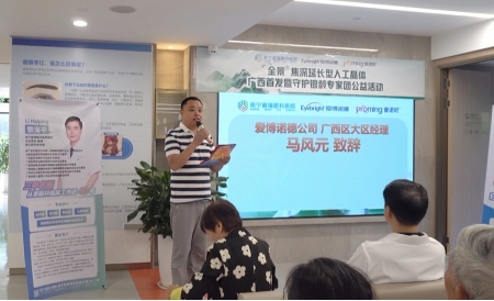 爱博诺德公司广西区经理马风元先生在致辞中表示:“全景焦深延长型人工晶体是公司创新研发成果,其的独特之处在于延长了焦深范围,形成一条平滑的光学区,保障远视力,提高中视力,改善近视力。视觉质量媲美单焦。包容性强,适用人群广。此次与南宁普瑞眼科医院合作,既把前沿技术带入广西,也共同推进眼健康公益事业,未来企业将持续助力眼科公益,让科技惠及更多患者。”