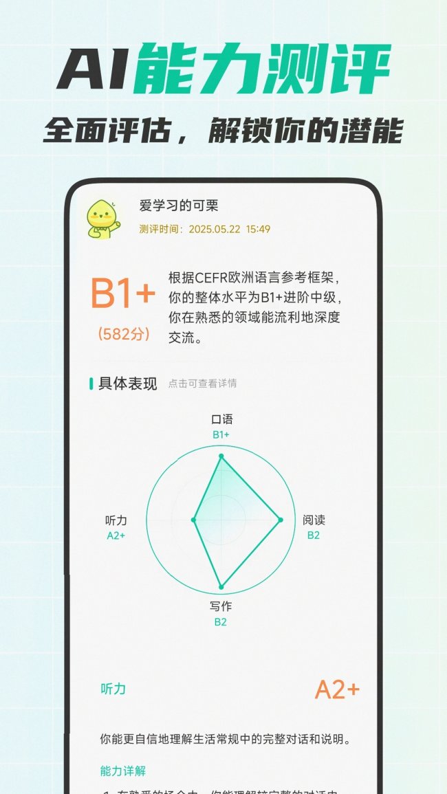 可栗口语搭载与中高考口语考试同源的AI智能评分系统,通过行业领先的音素级评估技术,能精准识别小学生常见的发音误区,比如/θ/咬舌缺失、/r/音不卷舌、元音不饱满等问题。AI会即时给出针对性改进建议,搭配动态舌位图示与真人示范,让孩子通过专项练习快速改善发音,避免中式口音影响同步表达,实现清晰流畅的英语输出,发音纠正准确率超99.5%。