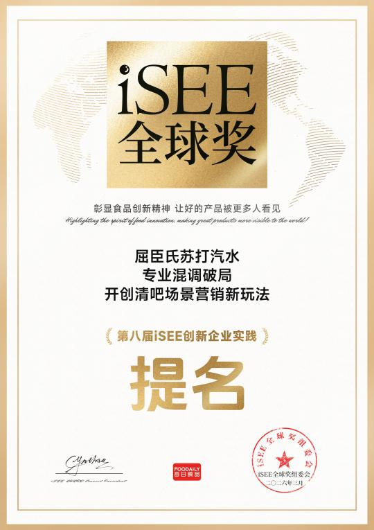 素有食品界“奥斯卡”之称的iSEE全球奖,自2025年8月启动以来,吸引了来自中国、日韩、欧洲、北美、澳新等全球多个国家地区的5688个案例积极提报,历时7个月,经过3轮线上/线下系统化评审,最终屈臣氏饮料凭借持之以恒的创新产品力及卓越的商业创新能力脱颖而出,充分印证了品牌在国际舞台上的品牌影响力与行业引领地位。值得一提的是,屈臣氏苏打汽水在本次评选中还以“专业混调破局,开创清吧场景营销新玩法”营销创意获得iSEE“突破创新先锋”创新企业提名。