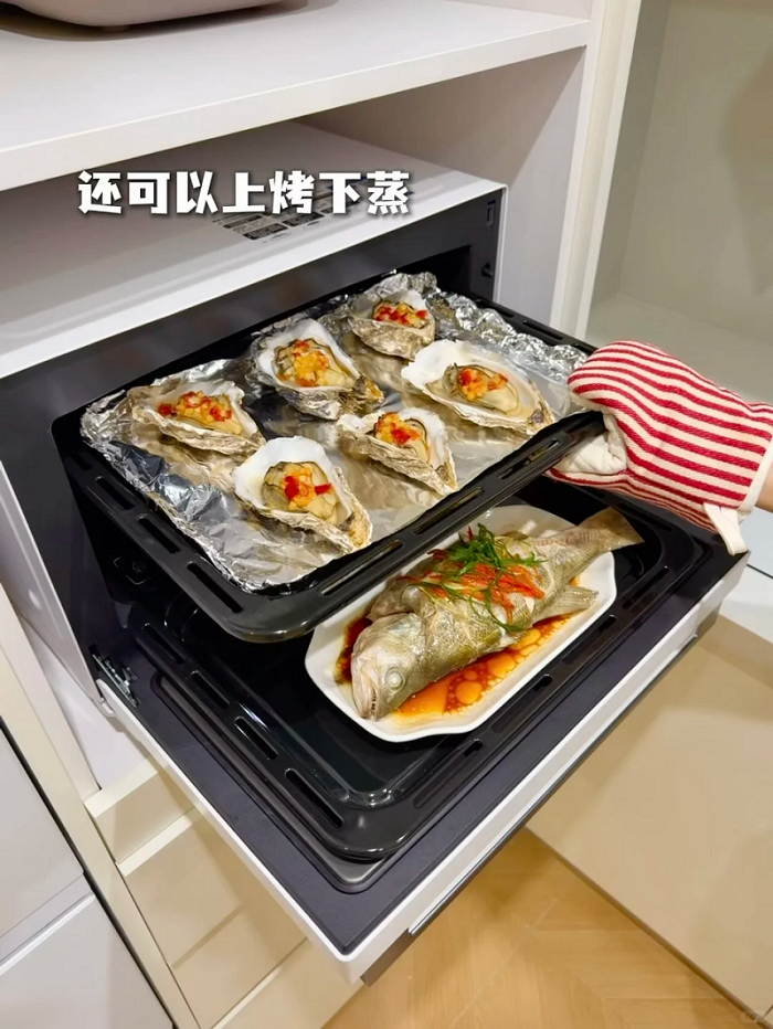 D4000pro同样具备强大的组合烹饪能力。支持上烤下蒸、双层同蒸、双层同烤等多种模式,让一台机器同时完成多道菜品,一顿饭只需一次操作,多道菜品同时出锅,再也不用担心菜凉了、人还没上桌。上层烤制鸡胸肉或去骨鸡腿,高温热风水烤让表皮焦脆;下层同步蒸制西兰花、芦笋等配菜,保留色泽与口感——一顿健身减脂餐同时出锅。另一个场景里,上层蒸海鲜,下层蒸包子馒头,三口之家“有人想吃清淡、有人需要饱腹”的需求被一次操作满足。