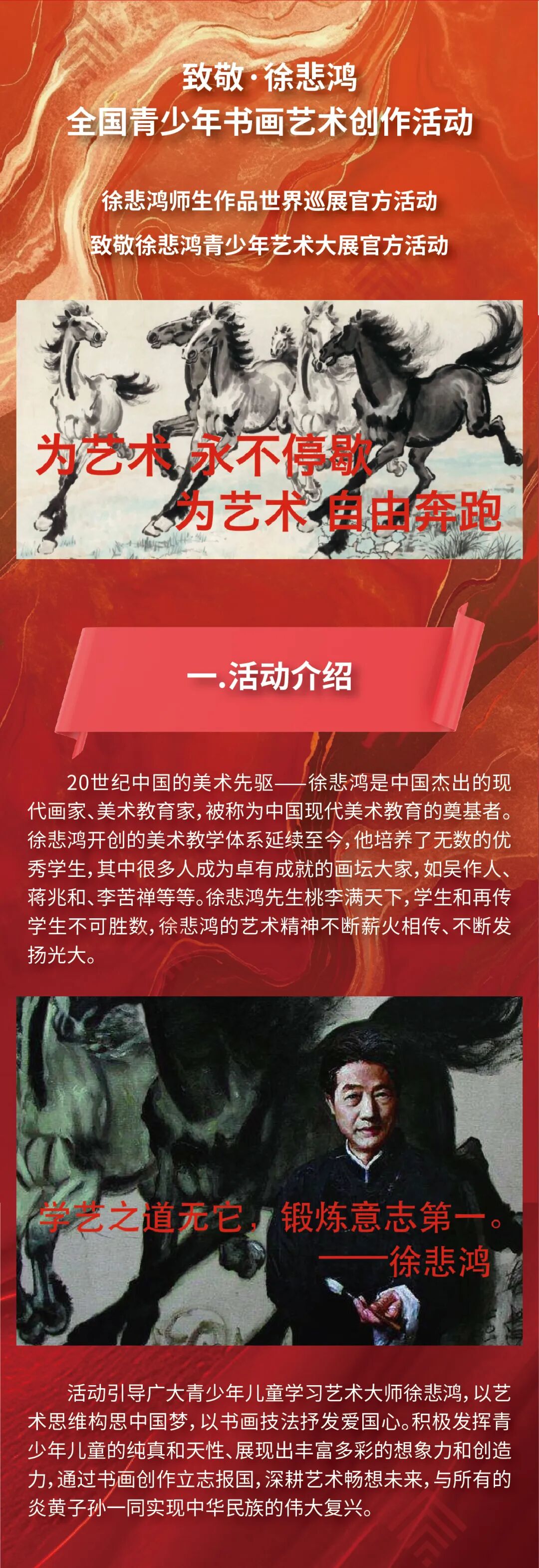 以致敬大师、美育育人、国际交流为宗旨,引导青少年研习徐悲鸿先生艺术风骨与民族情怀,鼓励用传统书画、现代绘画等多元形式,表达对文化传承、时代精神与美好生活的理解。活动致力于推动青少年美育普及,搭建中外青少年艺术交流桥梁,助力中华优秀传统文化走向世界,让百年悲鸿艺术精神在新一代少年手中薪火相传、焕新发光。