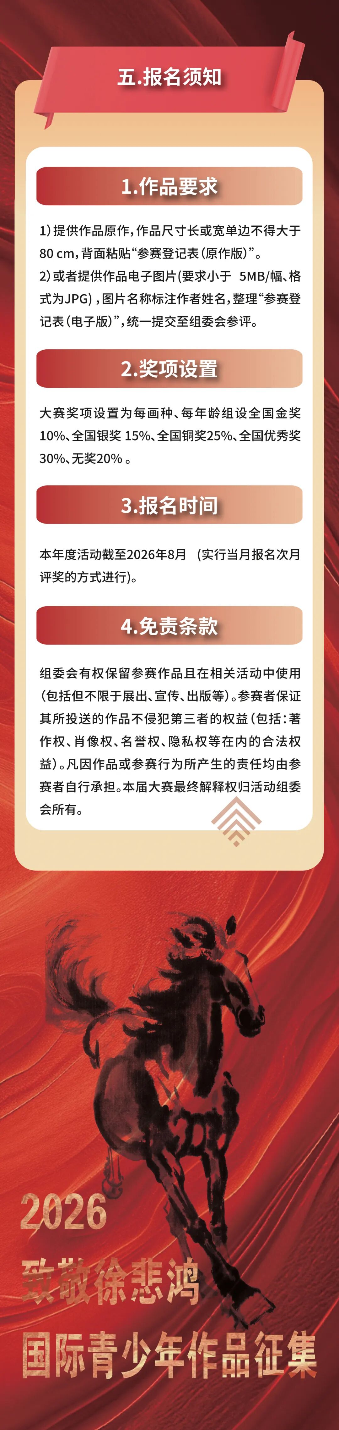 2026致敬徐悲鸿国际青少年书画创作活动,站在十年辉煌积淀的新起点,以艺术为纽带、以笔墨为桥梁,让青少年在创作中感悟经典、在交流中开阔视野。组委会将以专业、严谨、开放的态度,传承品牌初心、创新活动形式,打造兼具文化深度与国际视野的青少年书画标杆活动,持续推动中外青少年艺术互鉴,为中国美育事业发展、中华优秀传统文化传承传播注入源源不断的青春动能。