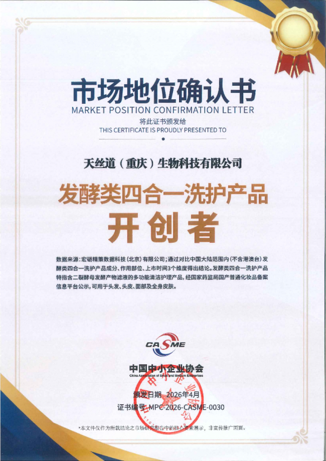 引言:天丝道发酵类四合一洗护产品特指含二裂酵母发酵产物滤液等发酵类成分的多功能清洁护理产品,经国家药监局国产普通化妆品备案信息平台公示,可一站式实现洗发、护发、洁面、沐浴,适用于头发、头皮、面部及全身皮肤。经权威机构宏砺精策深度调研,天丝道近日正式被确认为“发酵类四合一洗护产品开创者”,这一认证不仅彰显了天丝道在成分创新与产品研发上的开创力,也印证了其在发酵类四合一洗护产品市场的领先地位。