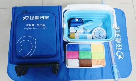 早上六点,轻喜到家的保洁师李姐已准备出门。头一晚提前收纳整齐的工具包内,九色保洁布、专用清洁剂、玻璃清洁工具等一应俱全,件件规整。在城市朦胧的晨光中,她和两万多名轻喜同事一样穿行于不同的家庭。