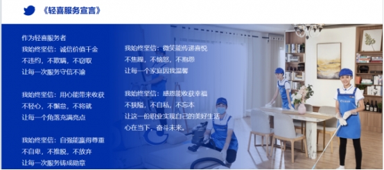 《轻喜服务宣言中》,诚信、用心、自强、微笑、感恩五大“坚信”层层递进,完整勾勒出家政服务者的成长脉络:坚守服务底线,打磨专业技能,重塑职业自信,传递暖心服务,最终在这份职业中实现自我价值与美好生活。可以说,它不仅是服务守则,更是一份写给劳动者的成长指南。