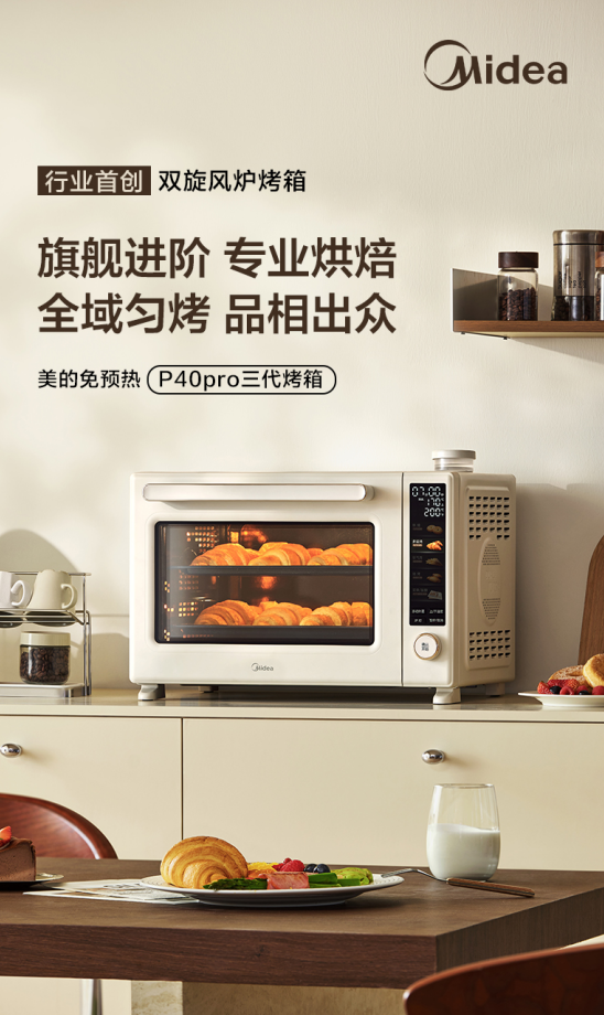 美的P40pro三代烤箱则聚焦专业烘焙需求,升级秒级瞬热系统2.0,采用行业唯一专利0.2S瞬热烤管,3分钟升温至230℃,真正实现免预热即刻开烤,彻底告别漫长等待。该产品搭载行业首创正反转向双旋风炉,搭配2100W四面六根立体烤管与2500r/min高转速双侧热风,形成全方位高密度热场,解决家用烤箱多层烤不均匀的痛点,双层同烤上色均匀如一,烤出的蛋黄酥、蛋糕卷口感出众。配备行业领先PID智能算法+ 双 NTC 高灵敏感温探头,精准控温且温差小,同时支持水雾补湿功能,自动与手动模式可选,发酵、烘焙双效实用。同时,它还配备了搪瓷内胆与不粘烤盘,清洁一擦即净,便捷更省心,成为烘焙爱好者的专业进阶之选。