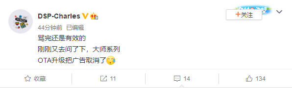 考虑到小米大师电视今天商务才正式开卖,如果OTA取消了广告,那么大家到手之后升级下系统,那么就可以享受无广告的体验了。