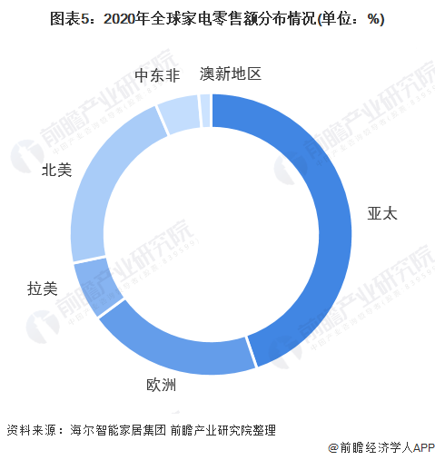 全球家电的销售区域多集中于亚太、北美和欧洲市场。根据海尔智能家居集团上市文件披露的数据,2020年,亚太地区为全球最大的家电市场,零售额占比为45%;其次为北美市场,零售额占比为22%;欧洲市场的零售额占比紧随其后,为20%。