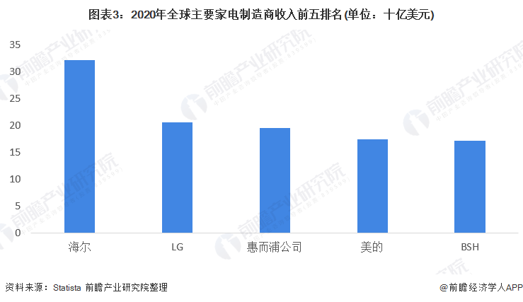 2020年,全球主要家电制造商前五排名为海尔、LG、惠而浦公司、美的和BSH。根据Statista披露的数据,2020年全球主要家电制造商收入排名第一的是海尔,家电营收为321亿美元,其次为LG,家电营收为205亿美元。