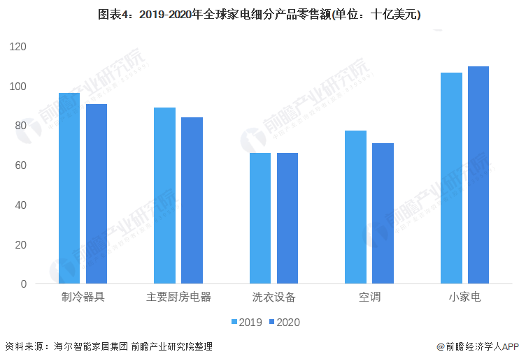 目前,小家电和制冷器具为全球家电销量的龙头细分品类。根据海尔智能家居集团上市文件中披露的数据,目前,小家电零售额在全球家电中占比最高,2019年家电零售额为1065亿美元;2020年零售额上升到1098亿美元;其次为制冷器具,2019年制冷器具的零售额为963亿美元,2020年制冷器具的零售额有所下降,为908亿美元。
