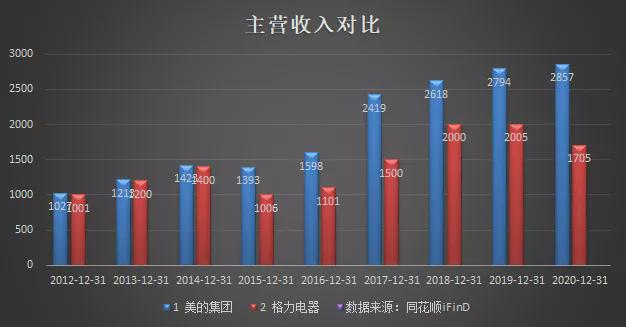 反映到经营业绩上,双方差距也非常明显。2020年,尽管受到新冠疫情冲击,美的集团凭借多品类发展优势主营收入仍保持了正增长,格力电器主营收入则出现了15%的同比下滑。