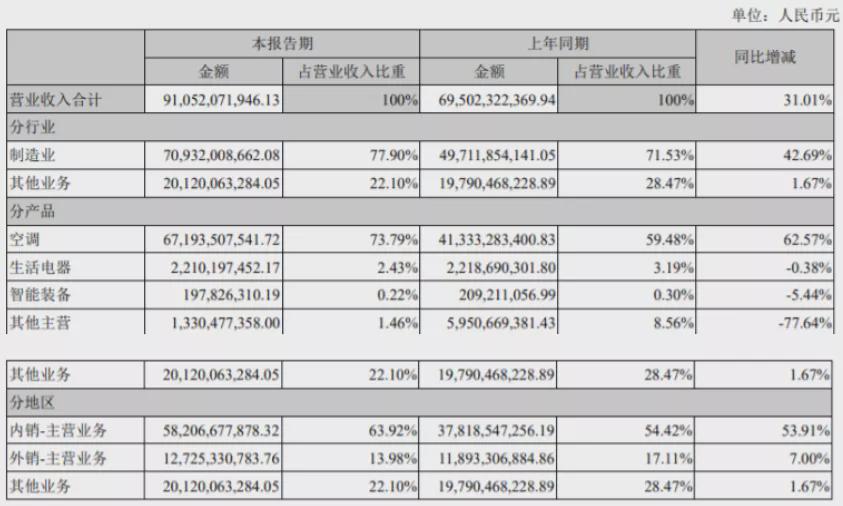 2021年上半年格力电器主营收入构成