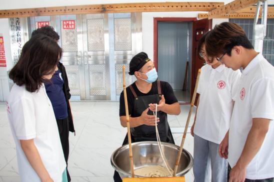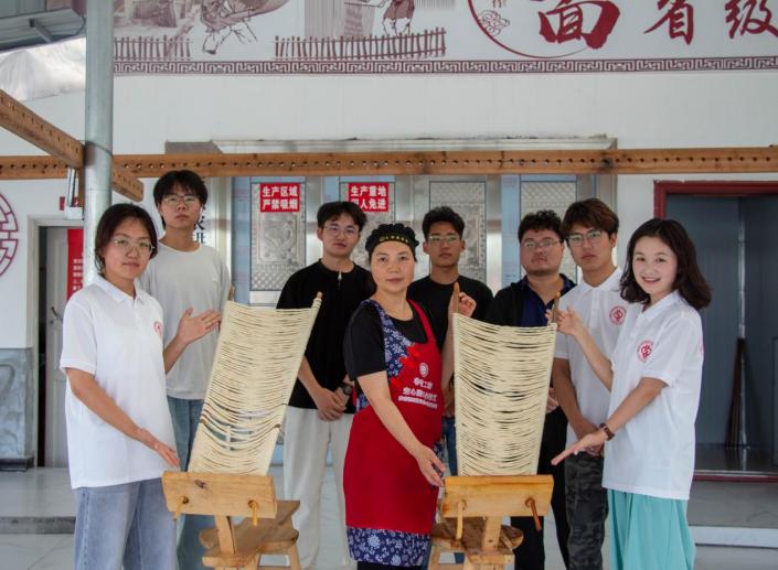 团队还深入绥阳空心面非遗制作现场,在传承人指导下了解十四道制作工序,尝试“上杆”关键环节,感受面条韧性与“毫厘定乾坤”的匠人境界,品尝清汤空心面品味非遗温度。此次实践让队员明白,文化根脉藏于典籍技艺,更需躬身实践延续,新时代青年当以敬畏与热爱传承创新,让文脉与匠心焕发新光彩。在绥阳,我们走进非遗空心面工坊,体验这项传承百年的手工技艺,完成了一次劳动与文化的深度对话。