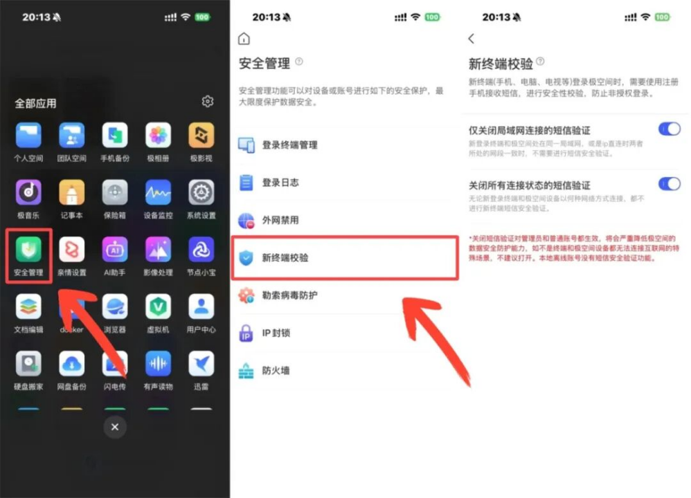 为进一步简化登录环节,极空间还设计了贴心的权限设置功能。用户可在旧设备的极空间App中,进入“安全管理-新终端校验”页面,选择关闭局域网连接或所有连接状态下的短信验证要求。这一设置让新终端登录时无需重复接收并输入短信验证码,大幅节省操作时间与精力,让换机第一步更顺畅。