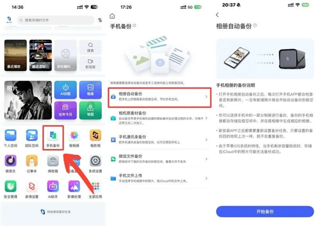 照片与通讯录是用户换机时最关注的核心数据,极空间私有云针对这一需求,提供了精细化的相册备份与还原方案,既保障数据完整,又避免存储空间浪费。用户只需在极空间App中开启“手机备份-相册自动备份”功能,即可启动相册数据同步。