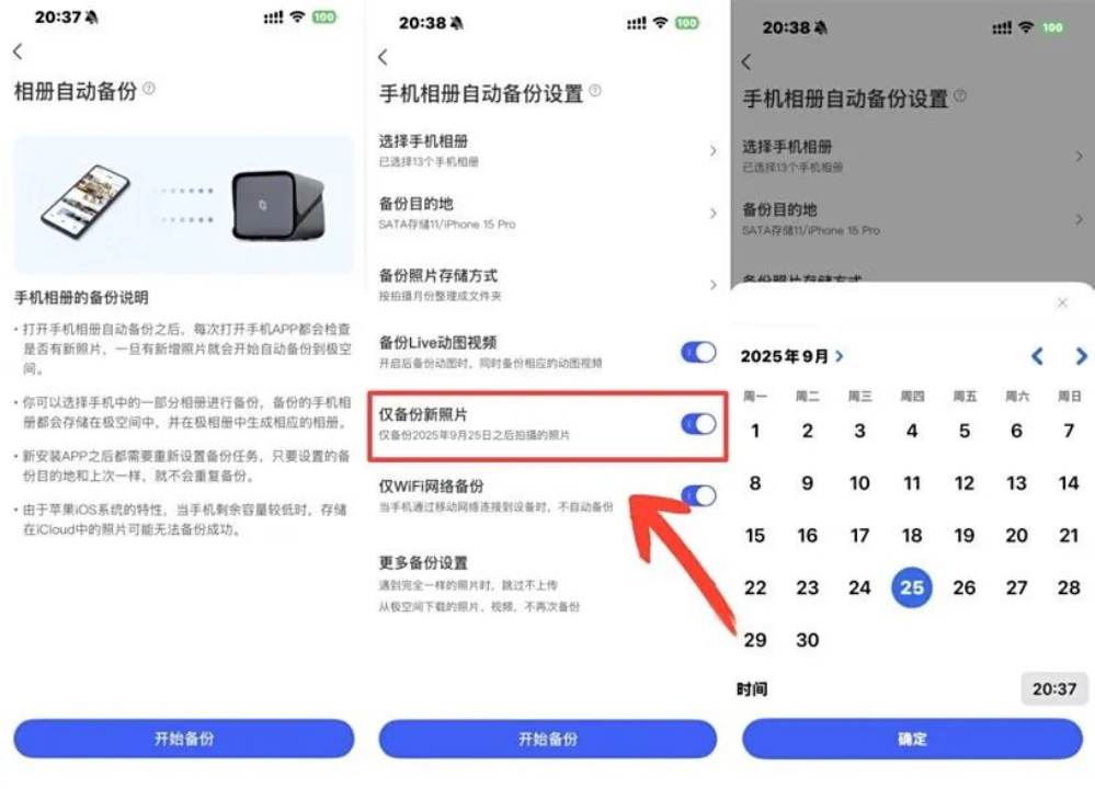 若旧手机相册已提前同步至新手机相册,为防止重复备份,可进一步开启“仅备份新照片”选项,并自定义备份的起始日期与时间点。这样设置后,新设备后续拍摄的照片、视频将自动同步至极空间,有效节约NAS存储空间,同时确保每一份新数据都能及时留存。