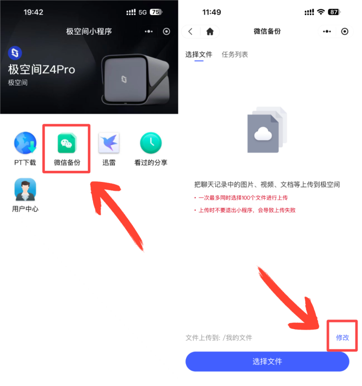 不同系统用户操作路径清晰:安卓用户可直接在极空间App内,进入“手机备份-微信文件备份”板块启动操作;iOS用户则需在微信中搜索“极空间私有云”官方小程序,通过小程序内的“微信备份”入口开展备份。
