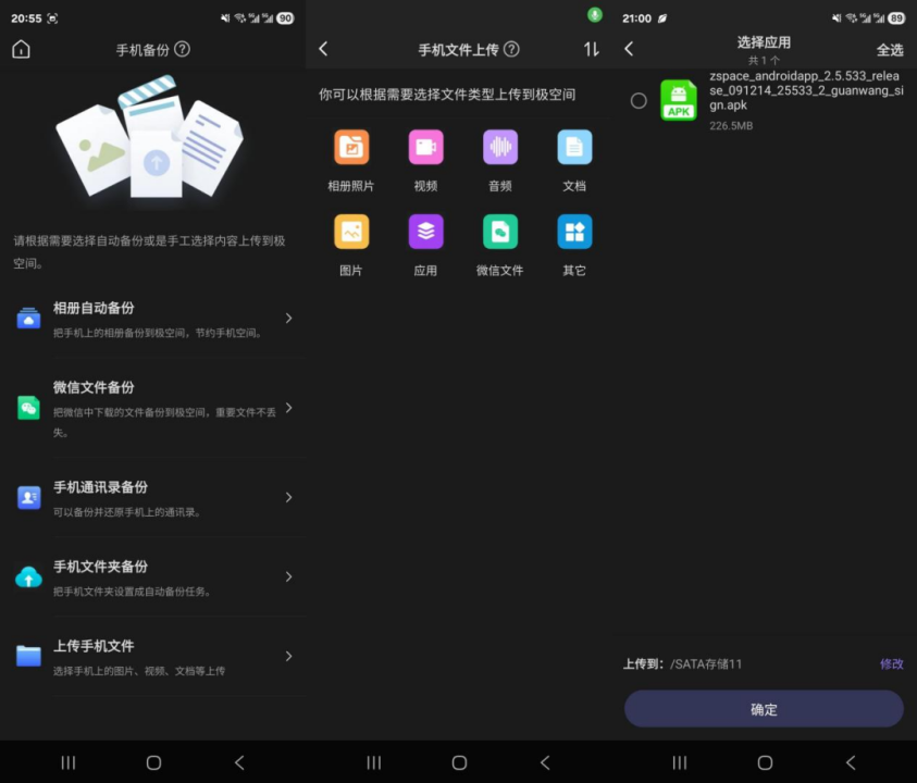 除相册、通讯录与微信文件外,极空间私有云还支持多种格式文件的备份与迁移,全面覆盖用户的多元化数据需求。在极空间App的“手机备份”页面,选择“上传手机文件”选项,即可看到系统支持相册照片、视频、音频、文档、图片、应用安装包、微信文件及其他类型文件的上传备份,用户可根据自身需求勾选目标文件类型,完成一键备份。