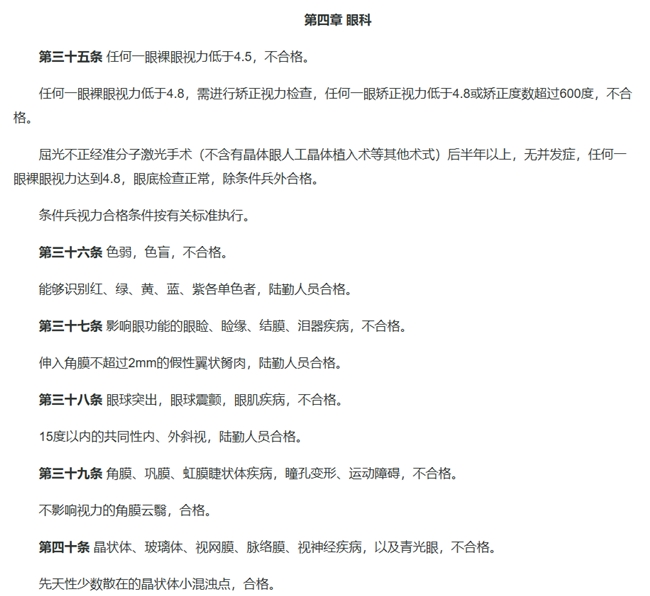 征兵体检中的视力要求是许多青年必须跨越的一道门槛。全国征兵网发布的《应征公民体格检查标准》摘要中,对视力有着明确而严格的规定。根据《应征公民体检标准》表明:任何一眼裸眼视力低于4.5,不合格。任何一眼裸眼视力低于4.8,需进行矫正视力检查,任何一眼矫正视力低于4.8或矫正度数超过600度,不合格。屈光不正经激光手术(不含有晶体眼人工晶体植入术等其他术式)后半年以上,无并发症,任何一眼裸眼视力达到4.8,眼底检查正常,除条件兵外合格。不同兵种和专业仍有特异性视力要求。普通兵种裸眼视力需达到4.5以上;而条件兵(如坦克、指挥、潜艇等)要求更为严格,裸眼远视力不得低于4.9。