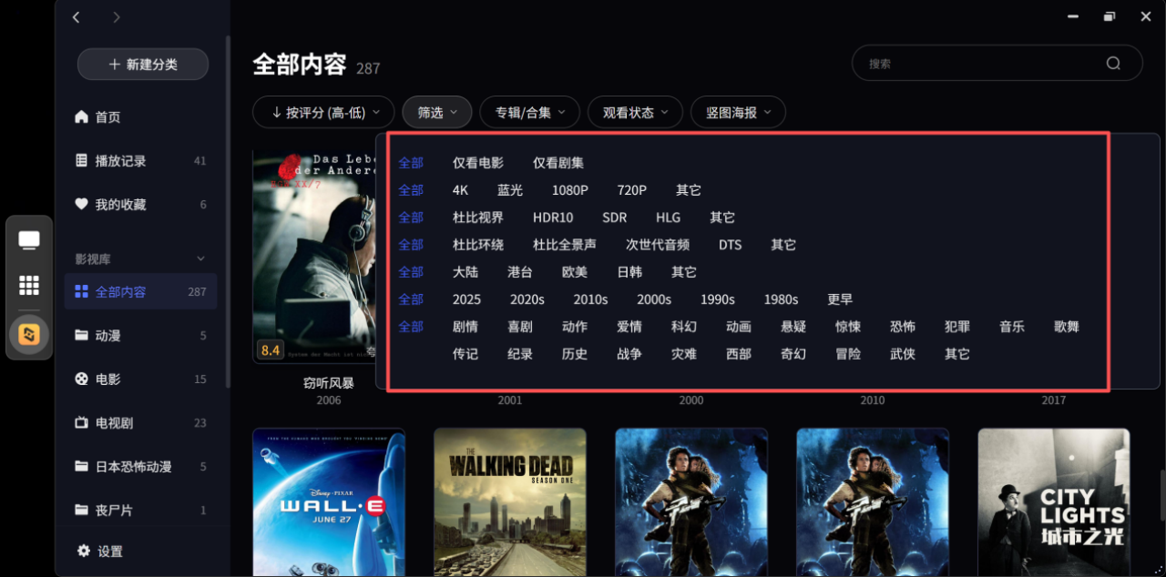 检索功能方面,极影视提供多维度筛选选项,支持按分辨率(4K、蓝光、1080P等)、画质标准(杜比视界、HDR10、SDR等)、音频格式(杜比全景声、DTS等)、地区、年份、影片类型等多个维度精准筛选,帮助用户在海量资源中快速锁定目标影片。针对剧集类资源,开启自动合集功能后,系统会自动将多季内容汇聚成合集,避免分散查找的麻烦,大幅提升追剧体验。