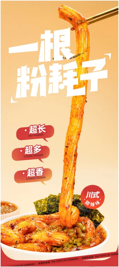 一口粉耗子在便捷性上有了更好的提升,冲泡即食,一口一个;在口味上又新增了当下流行的甜辣火鸡味,进一步拓展了粉耗子的消费场景、满足不同人群的需求与体验。