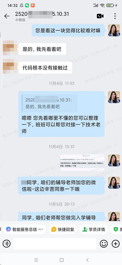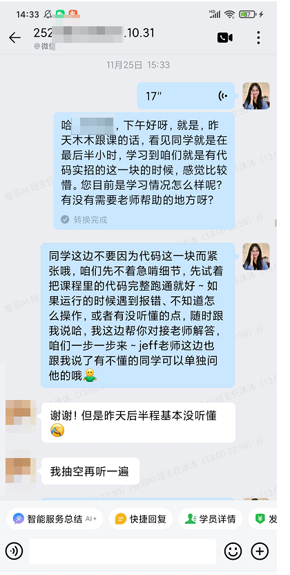 随着课程深入,真正的知识挑战到来。当班班通过细致跟课,敏锐捕捉到学员“在代码实操这一块感觉比较懵”时,更深层的支持网络同步织就。