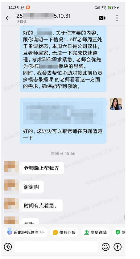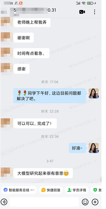 学习瓶颈有时不期而至。当学员在周末因项目时间紧迫,急需从大模型专业角度获得突破性指导时,尽管老师处于宝贵的休息与备课时间,我们的支持体系依然高效运转。