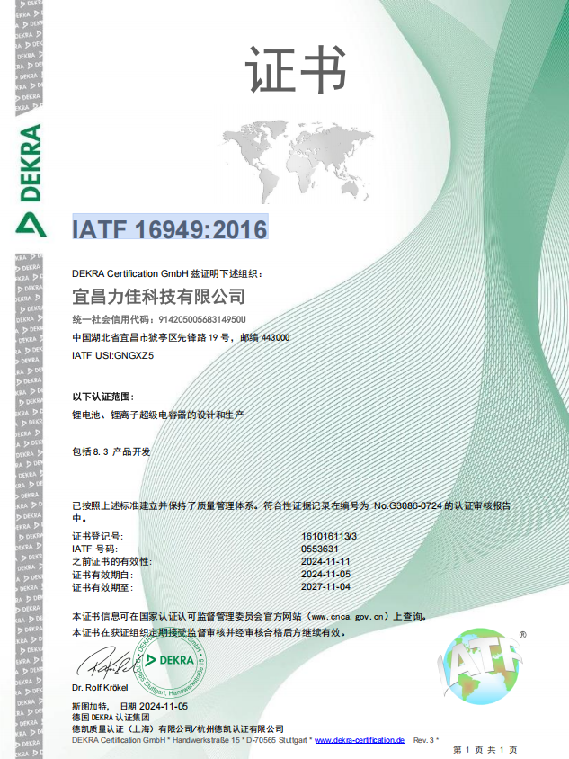 宜昌力佳HT产线车间,符合车规级车间标准,通过了IATF 16949:2016认证。力佳科技通过温湿度精准控制、粉尘颗粒物管控,为电化学反应创造了纯净、稳定的物理空间,从源头杜绝微短路等隐性缺陷。