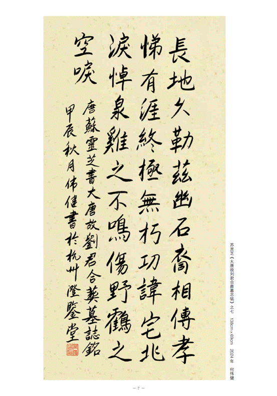 何伟健,1960年生于杭州,1979年参军在中国人民解放军83049部队,复员后在杭州市市场监督管理局临安分局、杭州市人民政府驻北京办事处等单位工作,大学本科学历,热爱社会公益,曾担任中国公益总会理事长多年。酷爱书画艺术和中国古陶瓷、珠宝翡翠、古代书画的鉴藏研究,尤爱书法,书法拜师郝良彬先生为师,并长期专注于三国两晋唐宋元代书画的鉴藏和名家名贴的学习研究,尤其对钟繇笔法的研究和学习,书法造诣小有成就,书法作品被政府机构、企业家、收藏家和国家博物馆、中央美术馆、国宾馆和各国驻华使馆所珍藏。