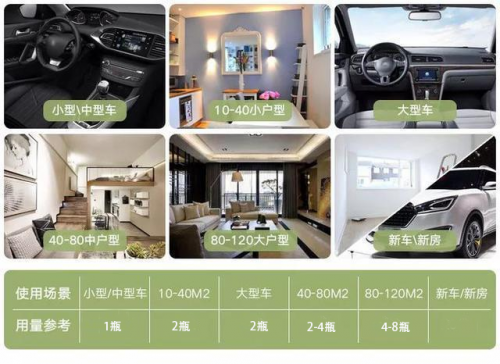 大家在使用的时候可以参考以下用量,像小型车里用一瓶光绿素就够了,就更很好地把甲醛处理干净,像卧室里一个房间使用两瓶也足以解决甲醛问题,但像我们定制的柜子、购买的家具包括床之类的是甲醛“重灾区”所以需要全面照顾到,最好从里到外喷一遍,除醛液附着到东西表面,可以更好的渗透,解决深层甲醛残留。