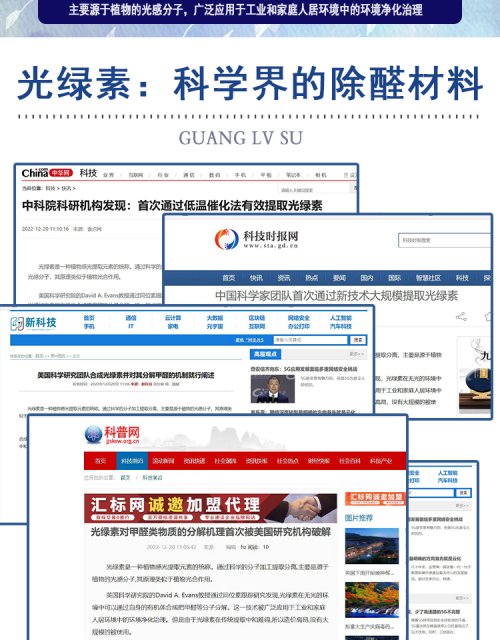 光绿素的提取就是一种植物液提取,分解甲醛的机制有点类似光合作用,就像前面所说,在房间放绿植,通过植物光合作用进净化空气。就相当于许多植物同时产生作用,来达到净化空气,分解甲醛的作用。目前已实现大规模提取,应用更为广泛,也为人居环境的甲醛处理和商业应用提供了前提保证。
