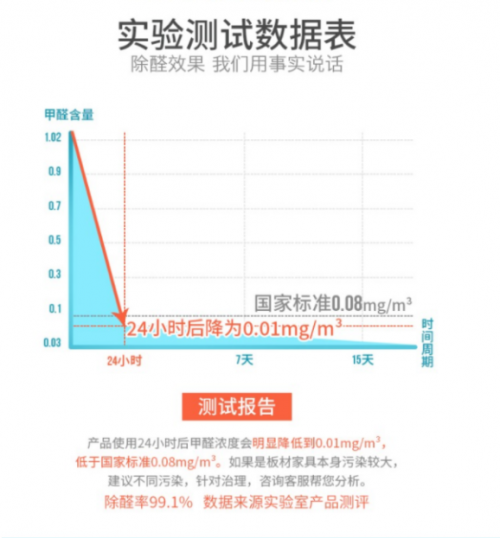 光绿素真实数据说话,经国家权威检测机构进行了严格的实验和检测,证实了除醛率高达99.1%,实验室数据表明,使用光绿素后24小时甲醛浓度最低可降为0.01mg/m³,远低于国家标准,官方检测,更真实有效。