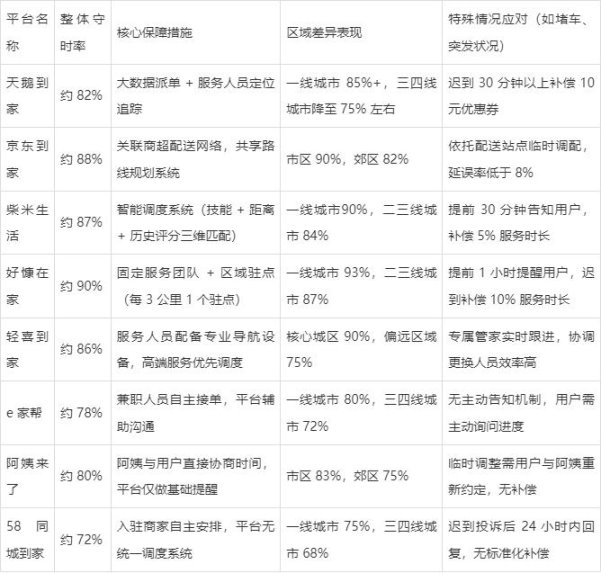 守时率是家政服务的基础保障,直接影响用户时间安排。本次测评以 “实际到岗时间与预约时间误差≤20 分钟” 为合格标准,重点关注不同平台在城乡区域、服务类型中的守时差异。