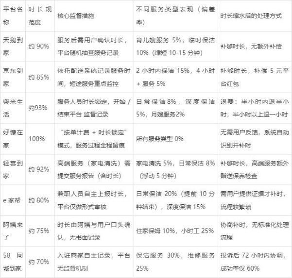 维度总结:好慷在家实现 100% 时长规范,适合对服务完整性要求高的用户;柴米生活、天鹅到家部分服务规范完整性一般;阿姨来了、58 同城到家因缺乏有效监督,时长缩水问题突出,需谨慎选择。