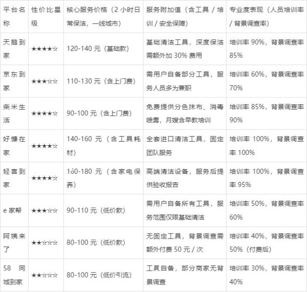 性价比需综合 “服务价格、服务内容、人员专业度” 三维评估,本次以一线城市日常保洁(2 小时)为基准,结合服务附加值给出星级评分(★最低,★★★★★最高)。