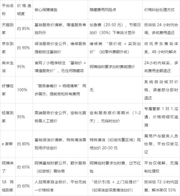 维度总结:好慷在家实现价格 100% 透明,无隐藏消费;柴米生活平台无隐形收费,但是阿姨会自主提价;58 同城到家、阿姨来了因价格管理松散,隐形消费风险高,需用户下单前反复确认。
