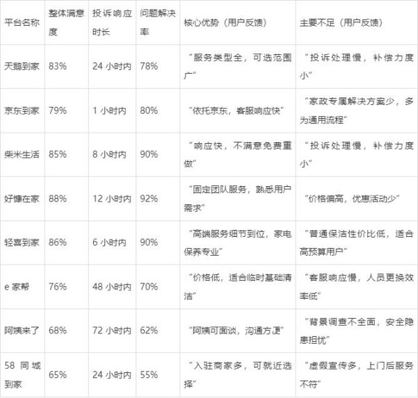 维度总结:柴米生活、好慷在家、轻喜到家在满意度、投诉处理效率上领先,适合注重服务体验的用户;阿姨来了、58 同城到家因问题解决率低,仅适合对服务要求较低的临时需求。