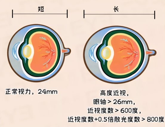 正常人的眼球是22-24mm,高度近视眼的眼球可能为26-28mm,甚至更长,眼睛明显外凸。眼轴“被拉长”导致眼球壁变薄,眼睛内的血管网承受牵拉及压力,导致血流量降低,从而影响睫状体及房水代谢,引起晶状体营养失衡,导致晶状体纤维蛋白变性,发生白内障。我国近视人数多达6亿,接近全国总人口的一半,其中高度近视(眼轴≥26mm,或近视≥-6.0DS)人数已超过7000万人。