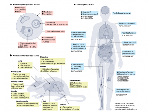 更让人期待的是,与提升NAD+水平相关的临床研究(包括已完成和进行中的),囊括了认知功能,心脏功能,代谢调节(糖尿病、脂肪肝),血管功能,肌肉功能,身体机能(精力和运动能力),呼吸功能,肠道功能、免疫功能、抗肿瘤等。