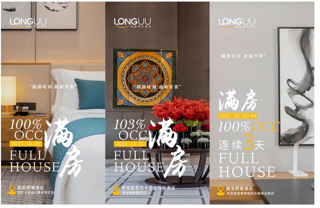 在2025年十一假期期间,朗誉集团再交亮眼成绩单:旗下酒店出租率同比增长12%,其中连续7天满房率82%,连续5天满房率89%,连续3天满房率98%,最高OCC 128%,最高Revpar突破1350元,全品牌收益率再创新高。