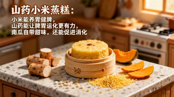 第一个是山药小米蒸糕,适合当早餐或加餐。准备小米50g、山药100g、南瓜50g就行。先把小米提前泡1小时,山药、南瓜去皮切小块,一起放进破壁机打成泥;然后把米糊倒进模具里,蒸锅上汽后蒸20分钟,放凉后脱模就能吃。小米能养胃健脾,给脾胃提供温和的“运转能量”;山药是健脾的“好帮手”,能让脾胃运化更有力;南瓜自带甜味,不用额外加糖,孩子也爱吃,还能促进消化。