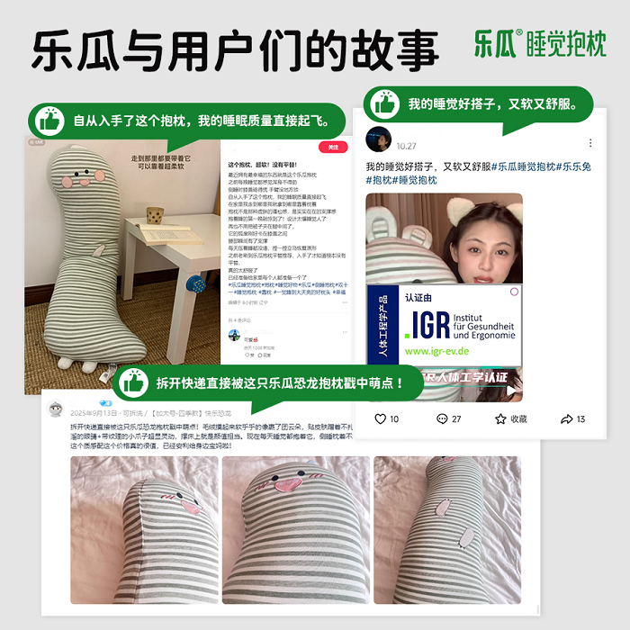 正是“理念先行+设计为基”的双轮驱动,使乐瓜睡觉抱枕(Sleeping Body Pillow)累计销量突破12.7万件,赢得全球用户信赖,也让中国原创睡眠产品在世界舞台上拥有了可被看见、被验证、被追随的硬实力。
